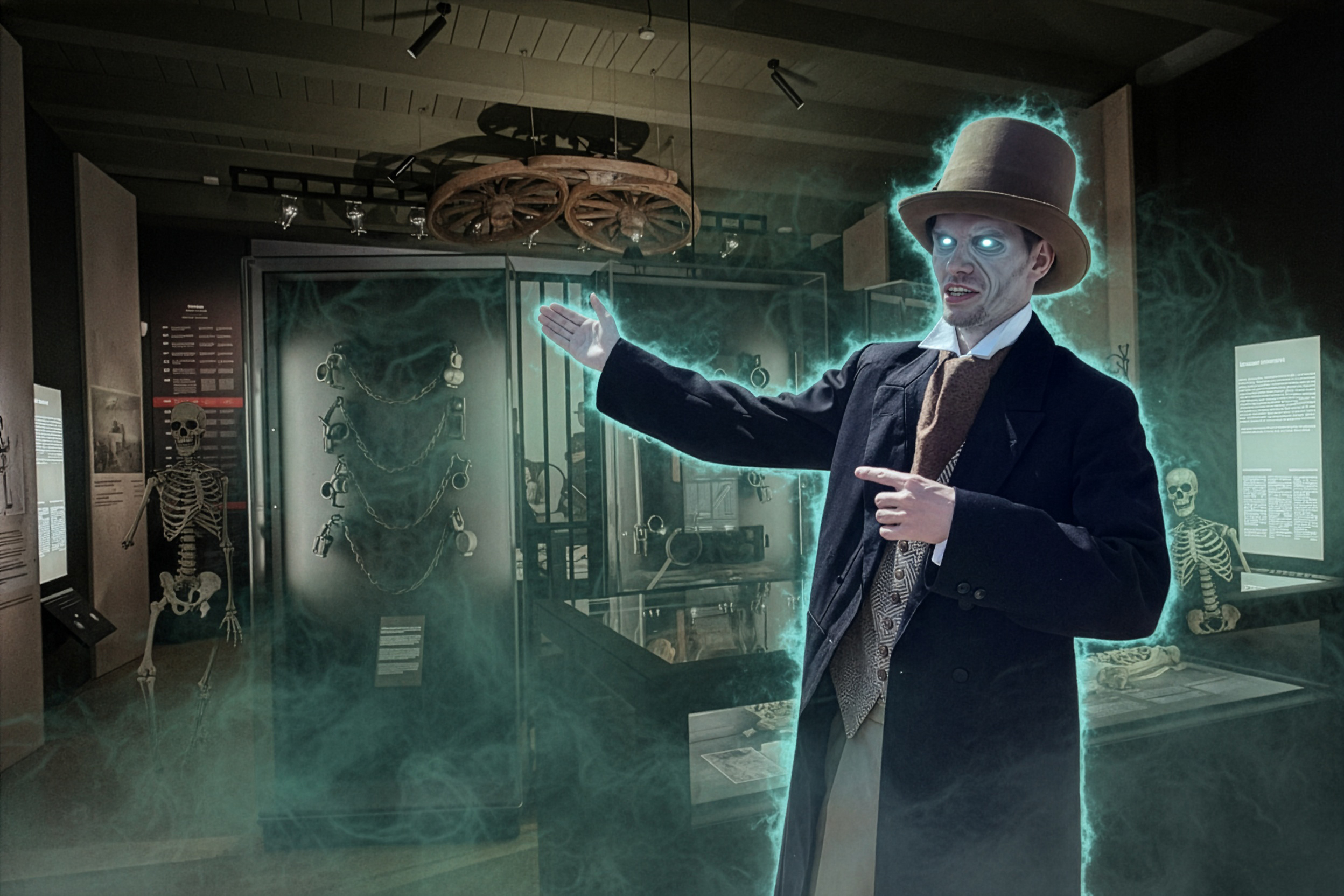 Når mørket falder på, vågner det gamle museum til live… Kom med på en gysende rundtur i selskab med genfærdet Hr. Topholt, der dukker op fra det hinsides for at fortælle om mord, myter og mystiske hændelser.